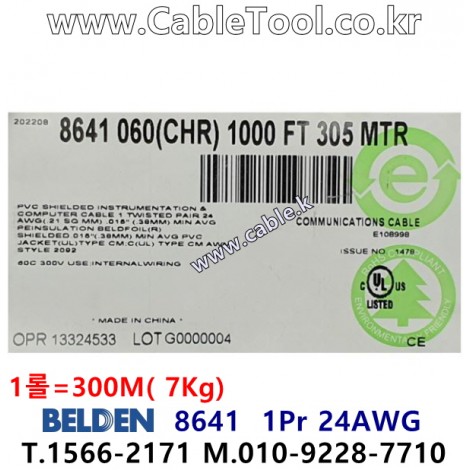 300m(롤) 벨덴8641 (미터당 ₩2,490) 벨덴케이블 8641 BELDEN 8641 1Pair 24AWG UL/CSA 300V계장용 크롬그레이 > 벨덴케이블 UL/CSA 300V계장용| 품명 | 상품페이지 참고 |