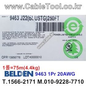 75m(롤) 벨덴9463 미터당 ₩4,340 벨덴케이블 9463 BELDEN 9463 1Pr 20AWG BLUE HOSE