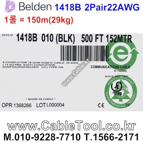 150m(롤) 벨덴1418B (미터당 ₩17,980) 벨덴케이블 1418B BELDEN 1418B 5Coax 26AWG RG59 75옴 동축케이블 블랙 > 벨덴케이블 RG59 75옴 동축케이블| 품명 | 상품페이지 참고 |
