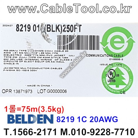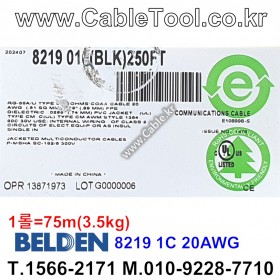 75m(롤) 벨덴8219 미터당 ₩2,790 벨덴케이블 8219 BELDEN 8219 1C 20AWG RG-58