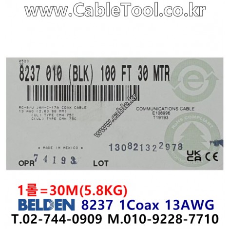 30m 벨덴 8237 미터당 ₩15,020 벨덴케이블 8237 BELDEN 8237 1Coax 13AWG > 벨덴케이블 RG8 50옴 동축케이블| 품명 | 상품페이지 참고 |