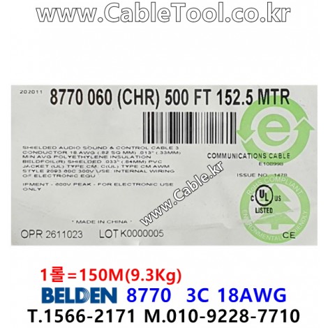 150m(롤) 벨덴8770 미터당 ₩3,840 벨덴케이블 8770 BELDEN 8770 3C 18AWG UL/CSA 300V계장용 > 벨덴케이블 UL/CSA 300V계장용| 품명 | 상품페이지 참고 |