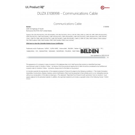 BELDEN UL Certificate (Communication Cable), DUZX.E108998 > 인증서 & 기술자료Communications Cable