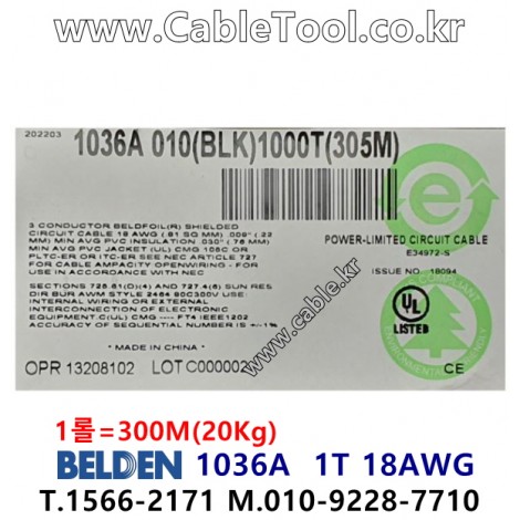 300m(롤) 벨덴1036A (미터당 ₩10,290) 벨덴케이블 1036A BELDEN 1036A 1Triad 18AWG Multi Conductor 블랙 > 벨덴케이블 Multi Conductor| 품명 | 상품페이지 참고 |