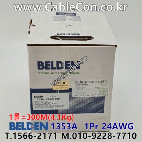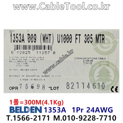 300m(롤) 벨덴1353A (미터당 ₩1,520) 벨덴케이블 1353A BELDEN 1353A 1Pair 24AWG Cat5E UTP 화이트 > 벨덴케이블 Cat5E UTP| 품명 | 상품페이지 참고 |