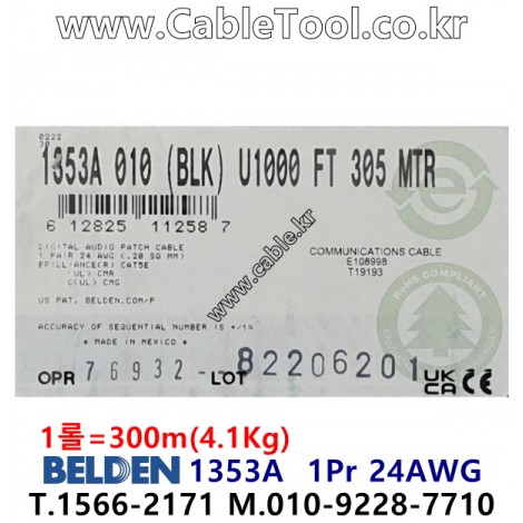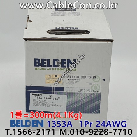 300m(롤) 벨덴1353A (미터당 ₩1,520) 벨덴케이블 1353A BELDEN 1353A 1Pair 24AWG Cat5E UTP 블랙 > 벨덴케이블 Cat5E UTP| 품명 | 상품페이지 참고 |