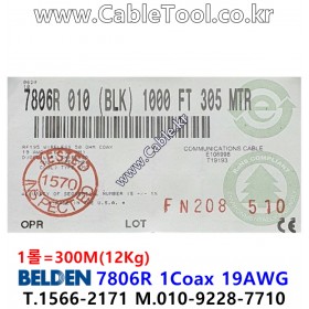 300m(롤) 벨덴7806R (미터당 ₩6,170) 벨덴케이블 7806R BELDEN 7806R 1Coax 19AWG RF 195 동축케이블 블랙