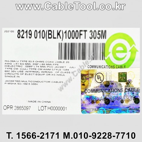 300m(롤) 벨덴8219 미터당 ₩2,700 벨덴케이블 8219 BELDEN 8219 1C 20AWG RG-58 > 벨덴케이블 RG58 50옴 동축케이블| 품명 | 상품페이지 참고 |
