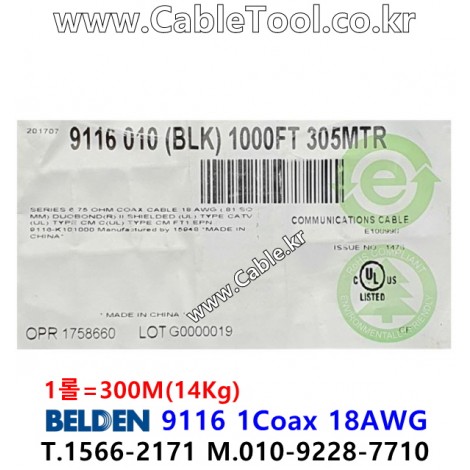 300m(롤) 벨덴9116 미터당 ₩640 벨덴케이블 9116 BELDEN 9116 1C 18AWG RG6 75옴 동축케이블 > 벨덴케이블 RG6 75옴 동축케이블| 품명 | 상품페이지 참고 |