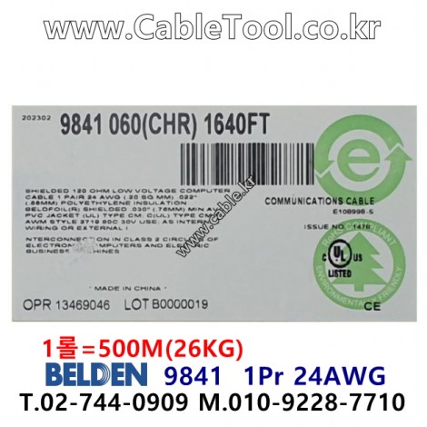 500m(롤) 벨덴9841 미터당 ₩3,000 벨덴케이블 9841 BELDEN 9841 1Pr 24AWG RS-485 > 벨덴케이블 RS485 | 품명 | 상품페이지 참고 |