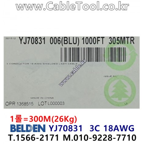 300m(롤) 벨덴YJ70831 (미터당 ₩5,250) 벨덴케이블 YJ70831 BELDEN YJ70831 3C 18AWG Multi Conductor 블루 > 벨덴케이블 Multi Conductor| 품명 | 상품페이지 참고 |