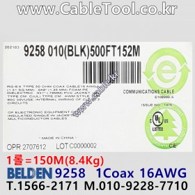 150m(롤 ₩723,000 ) 벨덴9258 (₩4,820/m) 벨덴케이블 9258 동축케이블 1C 16AWG RG-58 50옴 (블랙) BELDEN 9258